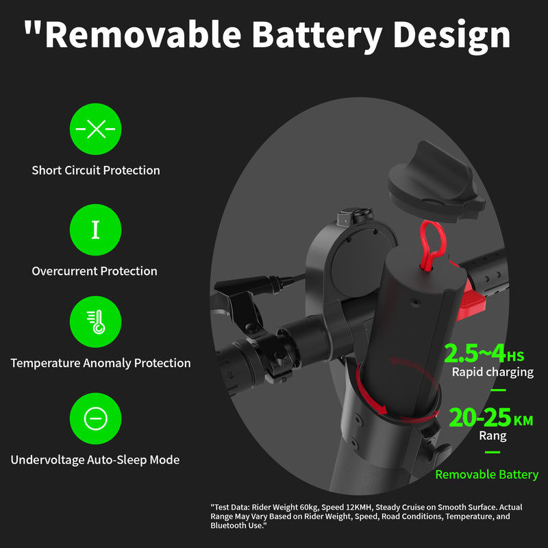 The scooter is powered by a 36V/5Ah battery that charges fully in just 2.5-4 hours. It can climb inclines of up to 15°, making it versatile for different urban landscapes. -